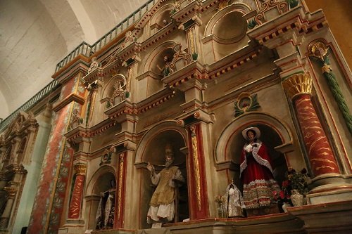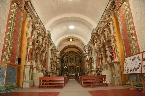 El interior de este templo aún conserva sus pinturas murales decorativas tanto en el plesbítero, como en las pilas tras la nave. El altar mayor y los laterales tallados en piedra son originales ejemplares policromados que están en el tránsito entre el barroco y el neoclásico, constituyendo uno de los más logrados momentos de la retablería sur andina de la segunda mitad del siglo XVIII.